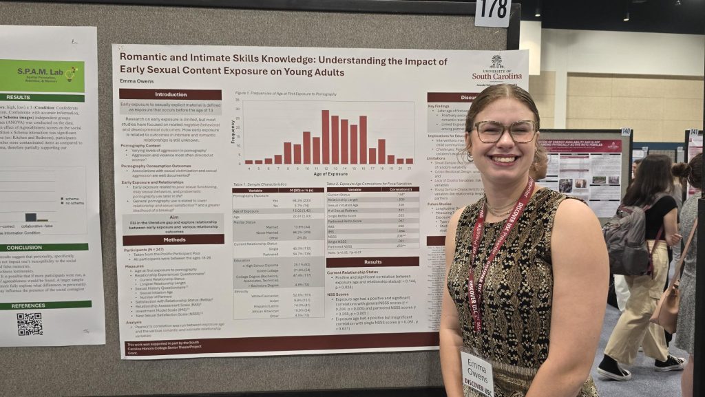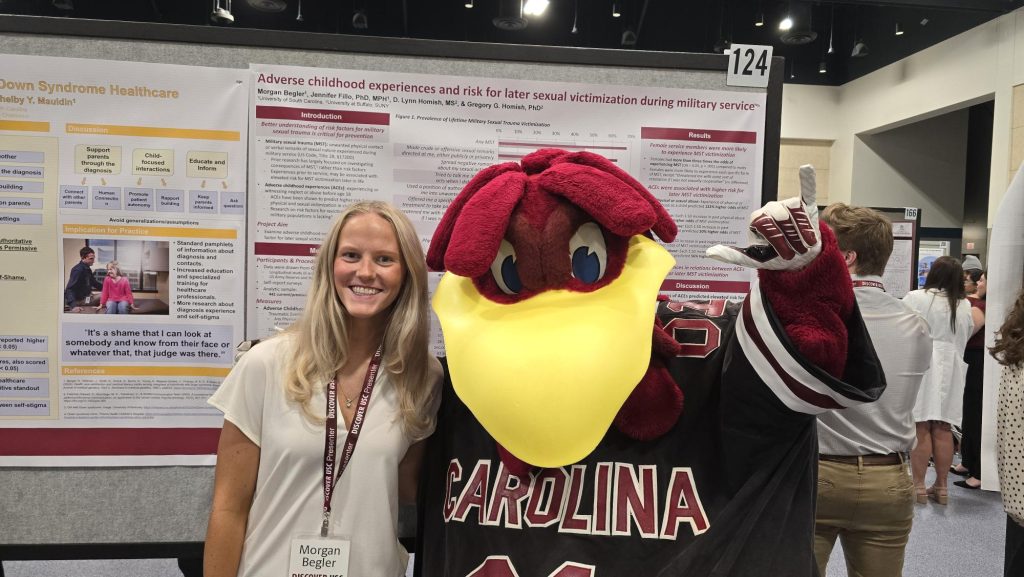Undergraduate research assistants Emma Owens and Morgan Begler recently presented at Discover USC and were part of a number of students who represented the research done at the Arnold School of Public Health. Morgan presented her project titled, “Adverse childhood experiences and risk for later sexual victimization during military service,” and Emma presented her research, “Romantic and Intimate Skills Knowledge: Understanding the Impact of Early Sexual Content Exposure on Young Adults.” Thank you Emma and Morgan for representing the CHARM Lab at Discover USC, great work!